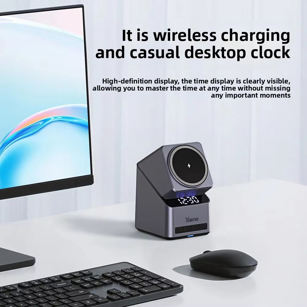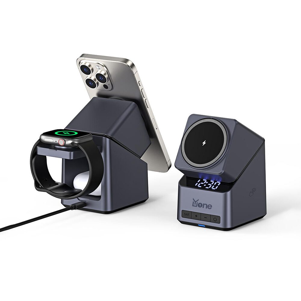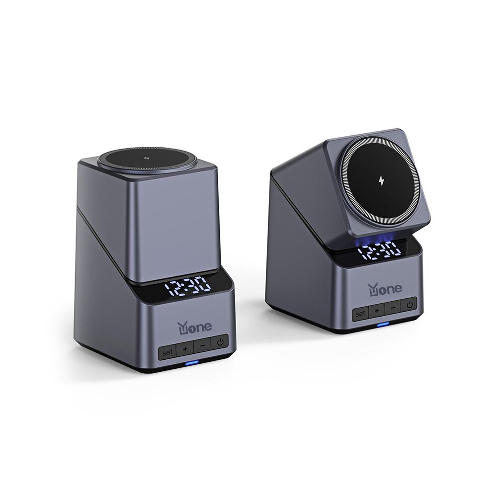 The YuOne ChargeCube 4-in-1 Fast Wireless Charger brings convenience and modern design together. With a rotating magnetic pad, 15W fast charging, and built-in LED clock, it powers your phone, smartwatch, and earbuds at once. Compact and elegant, it’s the perfect all-in-one charging solution for home or work.