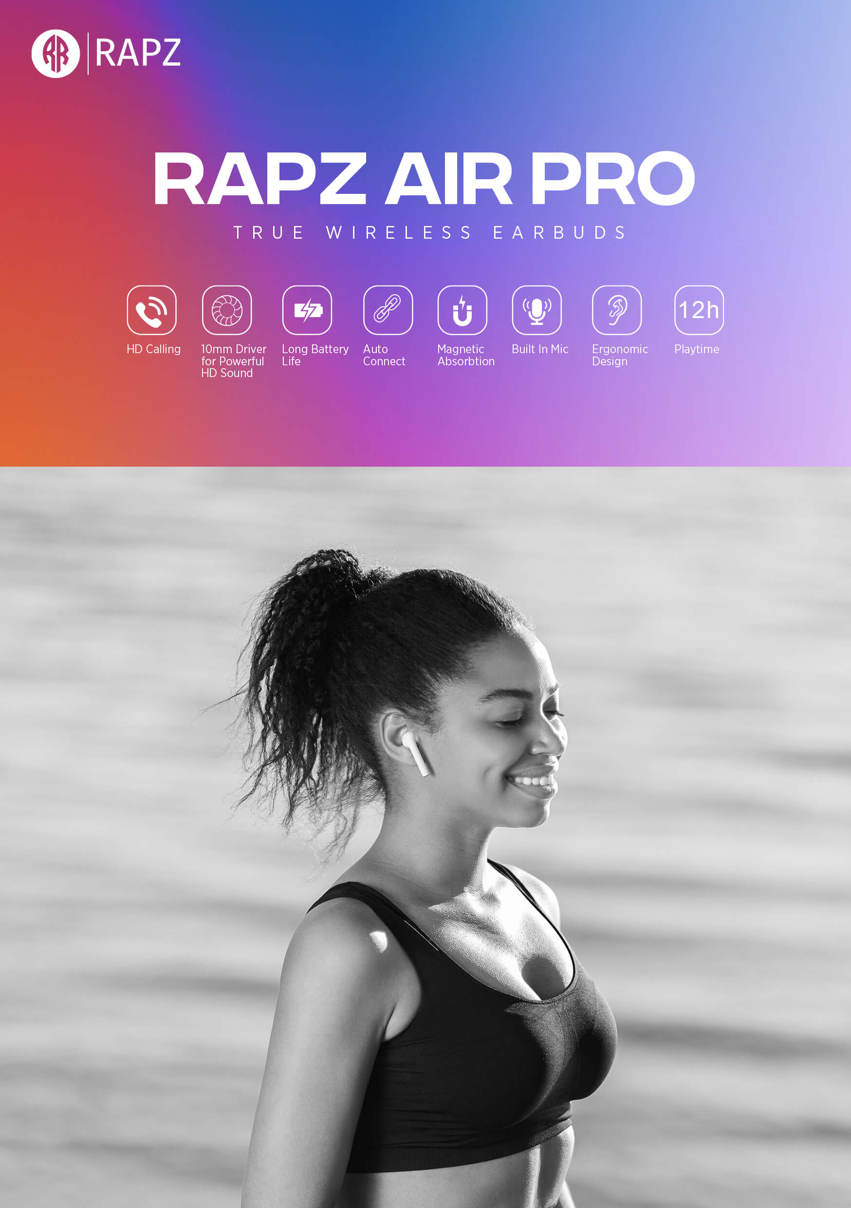 Rapz Air Pro True Wireless Earbuds with Mic have a dynamic driver that ensures low distortion and focuses on all frequencies to deliver the complete sound experience. It uses the latest Bluetooth 5.0 technology for better audio quality, improved wireless range, and minimal audio lag. True wireless freedom allows you to enjoy music while running, gaming, jogging, etc. It has a secure fit design that makes it ideal for outdoor activities. It has been carefully crafted for your all-day listening pleasure. It is snug you’ll forget you’re wearing them