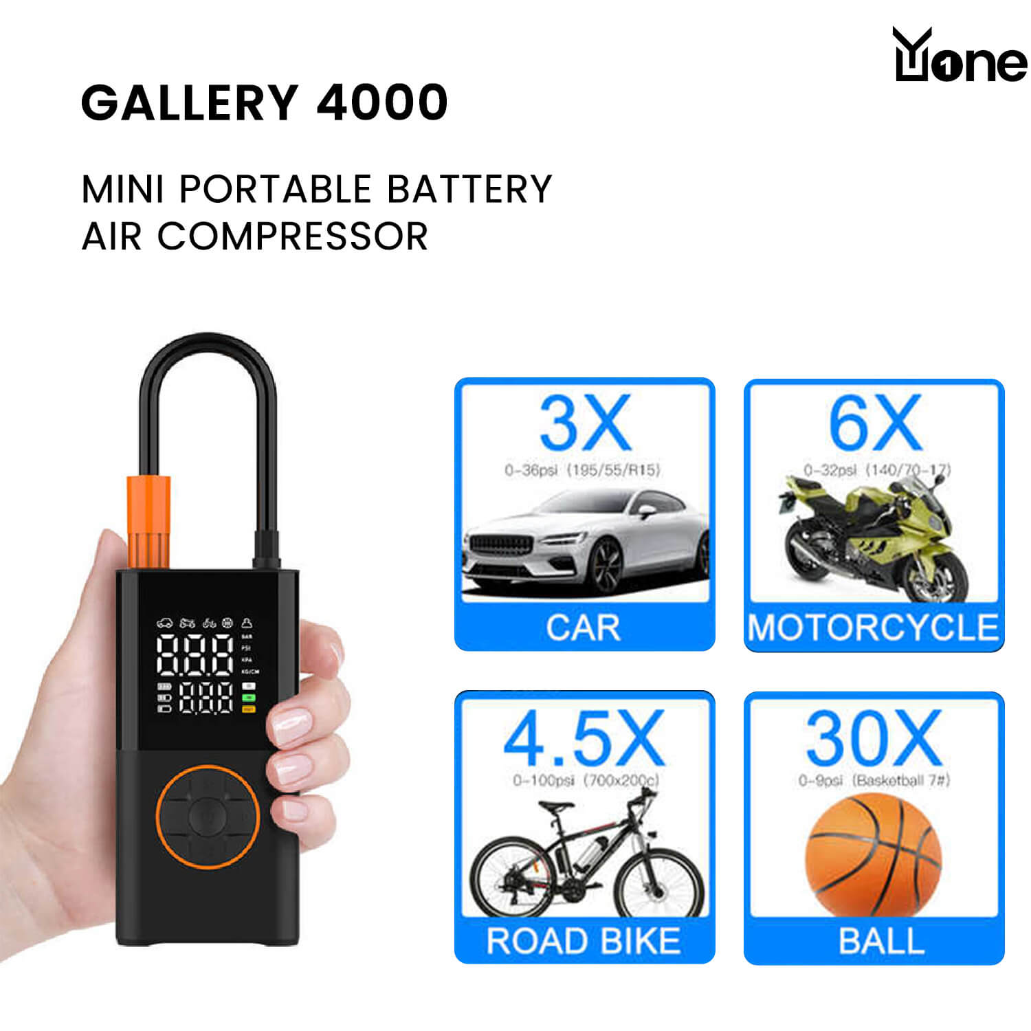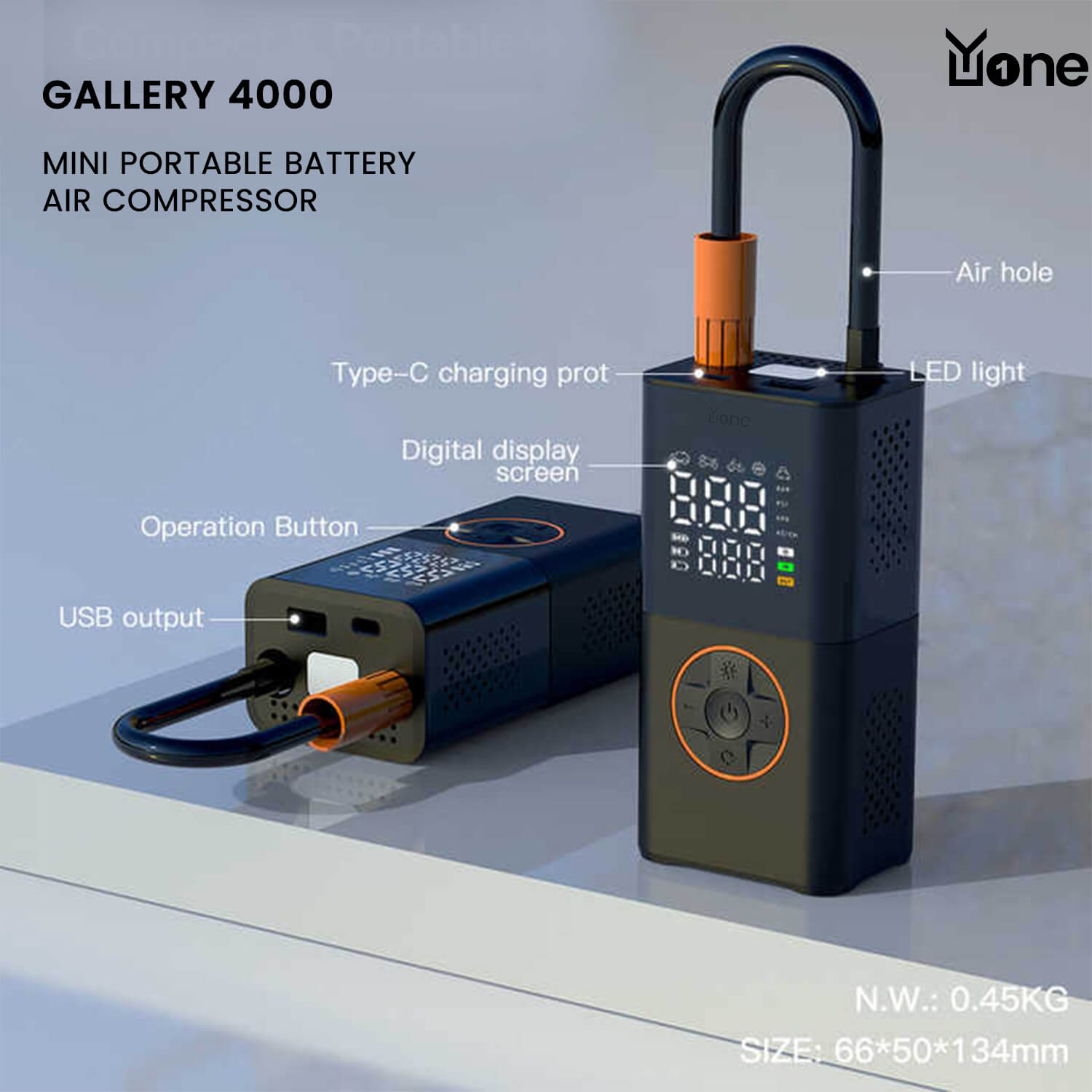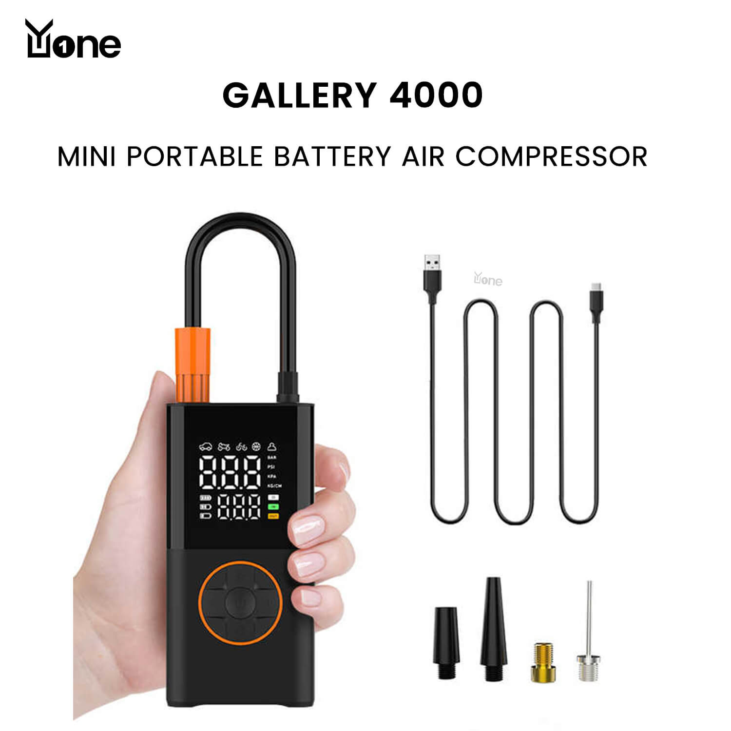 The YuOne Gallery 4000 Mini Portable Battery Air Compressor is a compact yet powerful tyre inflator designed for convenience on the go. With a max pressure of 150 PSI, it quickly inflates car, bicycle, and motorcycle tyres in just 8 minutes. Featuring a digital pressure gauge, auto-stop function, and built-in LED light, it ensures accurate inflation and is perfect for emergencies. Its 7.4V battery YuOne Gallery 4000 Mini Portable Battery Air Compressor is a compact yet powerful tyre inflator designed for convenience on the go. With a max pressure of 150 PSI, it quickly inflates car, bicycle, and motorcycle tyres in just 8 minutes. Featuring a digital pressure gauge,auto-stop function, and built-in LED light, it ensures accurate inflation and is perfect for emergencies. Its 7.4V battery power, 2000mAh dual
