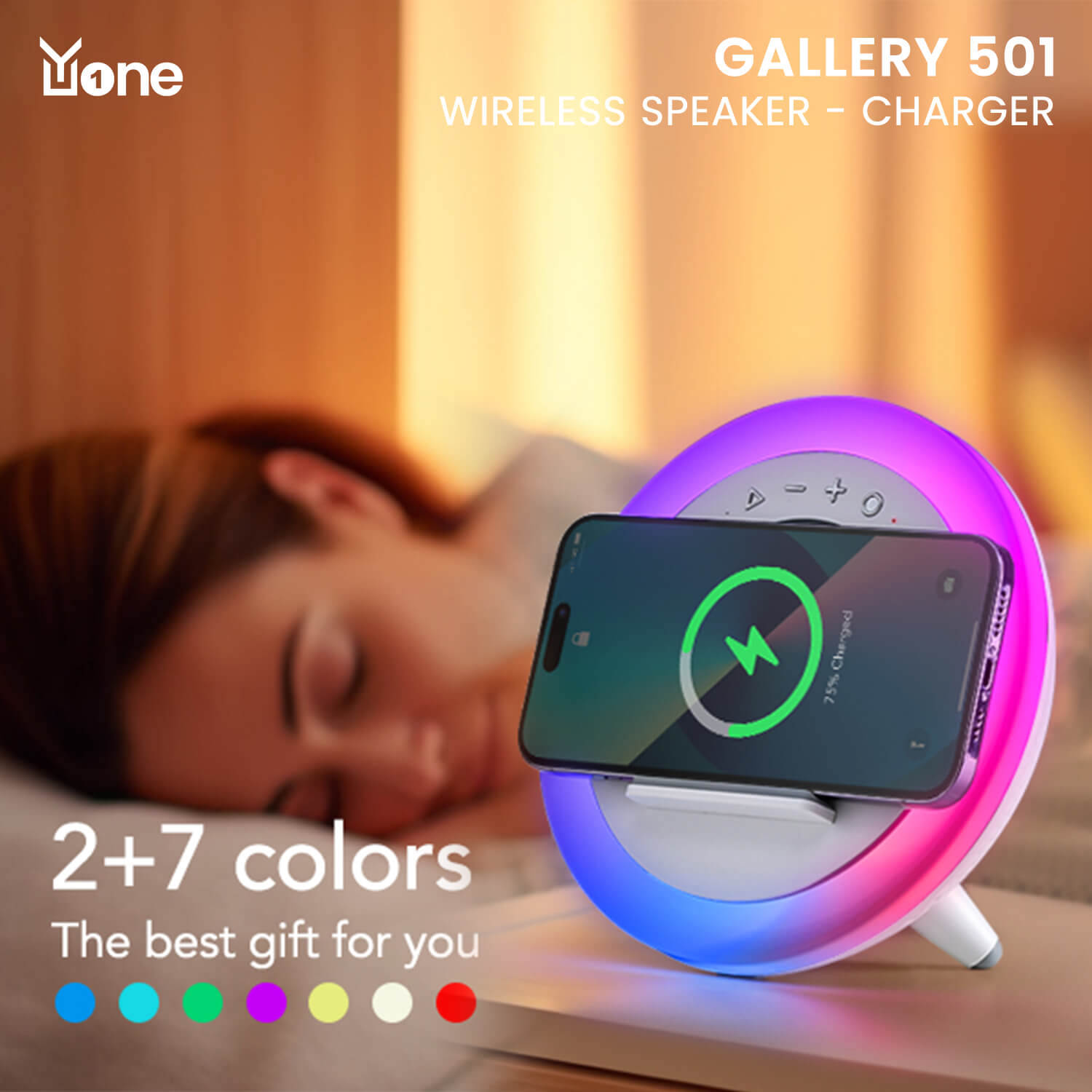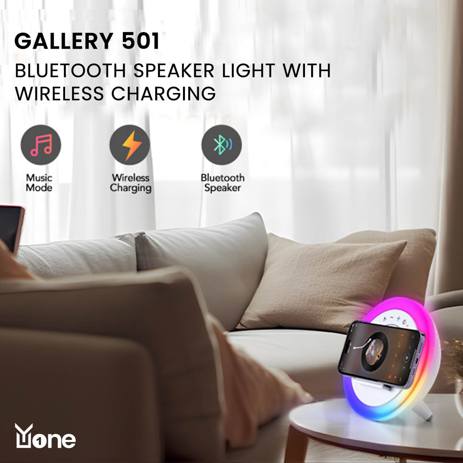 for seamless connectivity, it delivers crisp sound with a 4 Ohm,5W speaker. Enjoy the convenience of 10W wireless charging for your devices, while the integrated 2W light provides ambient illumination. Compact and stylish, the Gallery 501 measures 170×90×170 mm, making it perfect for any space. Enhance your audio experience and keep your gadgets powered effortlessly with the versatile YuOne Gallery 501.