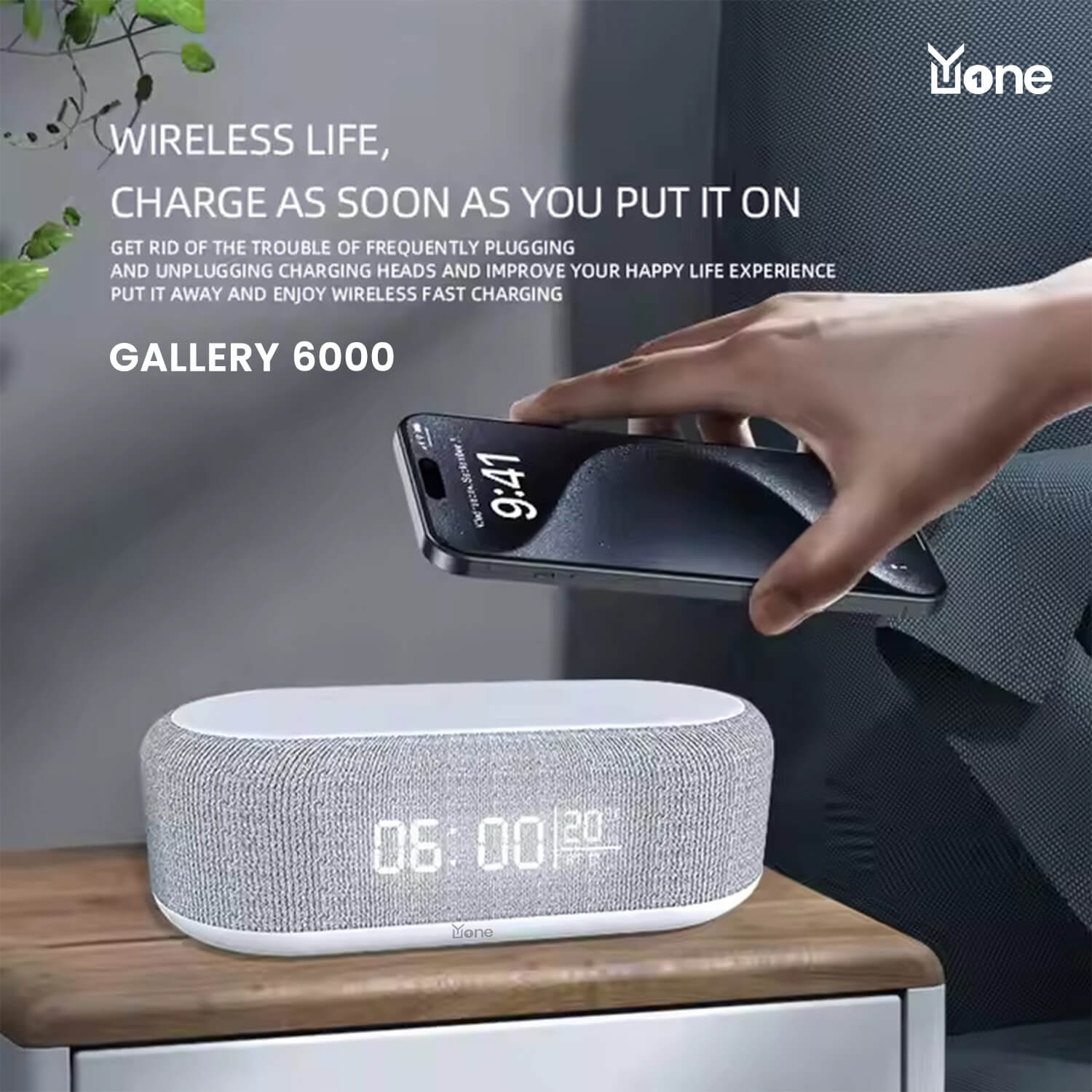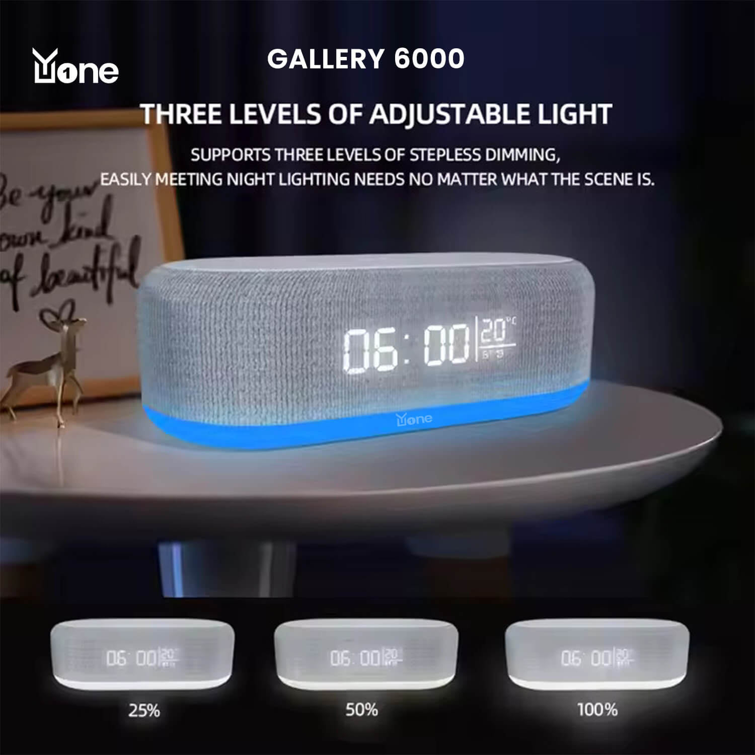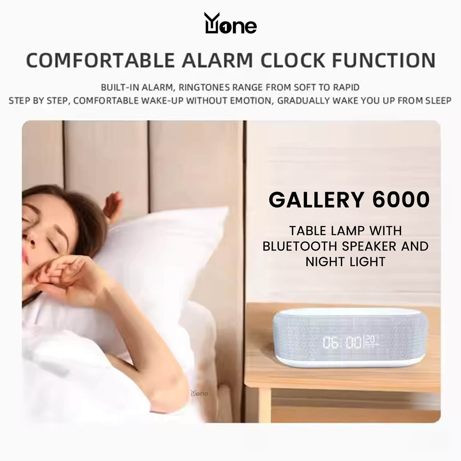 The YuOne Gallery 6000 Table Lamp Bluetooth Speaker with Night Light is an innovative, multi-functional device that combines a speaker, night light, alarm clock, and wireless phone charger in one sleek unit. Ideal for users seeking convenience and style, it features Bluetooth connectivity for easy music streaming, 3-gear dimming for adjustable brightness, and RGB LED lighting to create a vibrant ambience. The built-in wireless charger keeps your phone powered without the hassle of cables. Compact and lightweight, measuring just