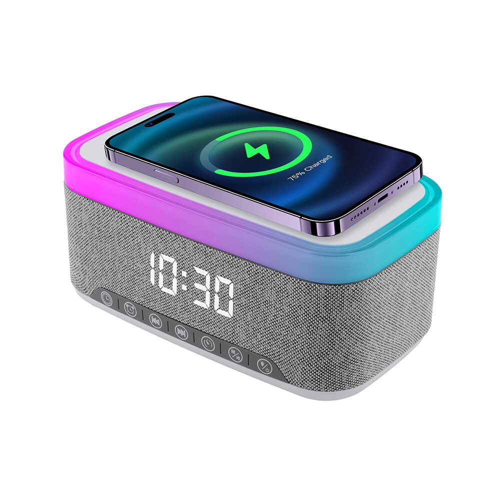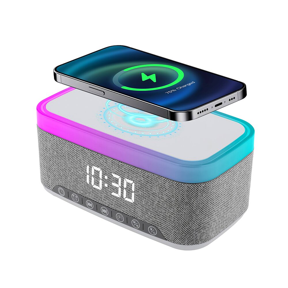 4-in-1 Multifunction Design: Combines a 15W fast wireless charger, Bluetooth speaker, digital alarm clock, and RGB ambient night light in one compact unit.