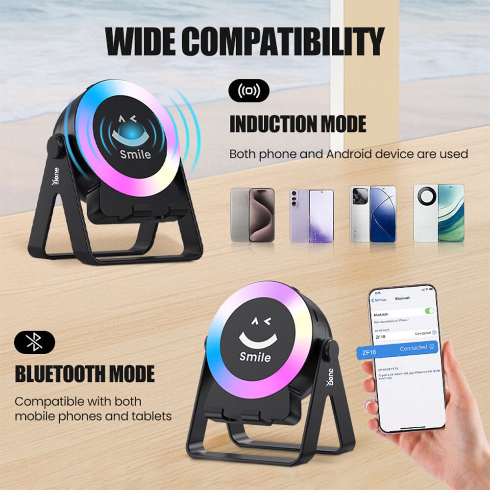 The YuOne GlowBeat Sensor RGB Speaker combines vibrant lighting, smooth Bluetooth playback, and a built-in phone stand in one compact device. With induction mode, RGB effects, and splash resistance, it’s perfect for desks, bedside tables, outdoor hangouts, and parties—adding color and fun to every moment.