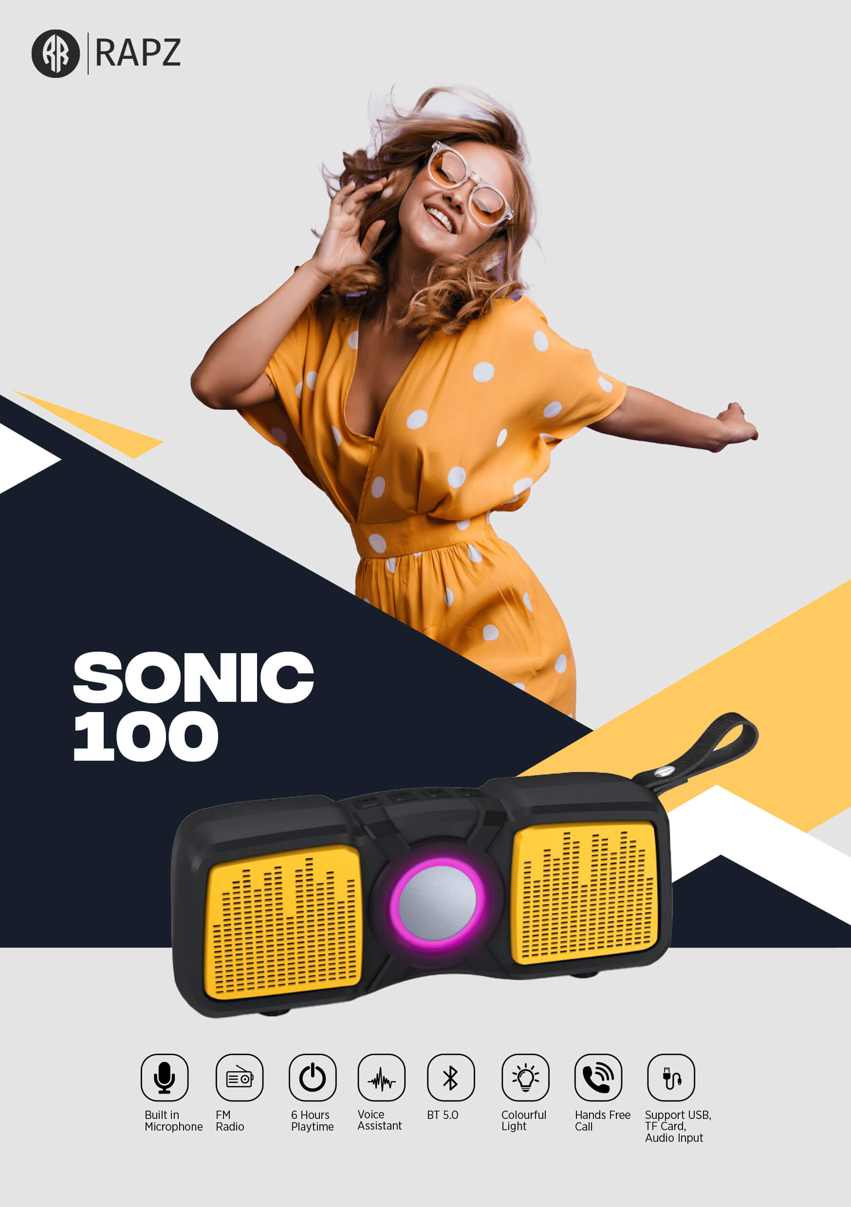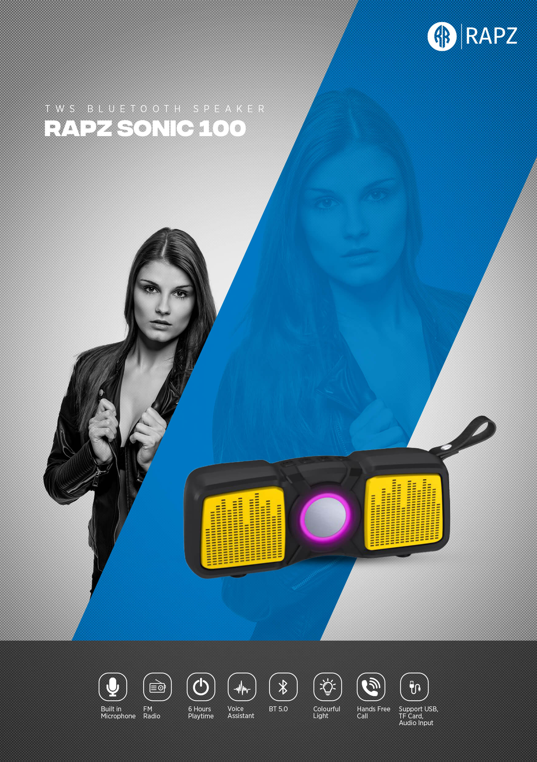 Enjoy a powerful and wireless music experience with the high-performing Rapz Sonic 100 Portable Bluetooth Speaker.